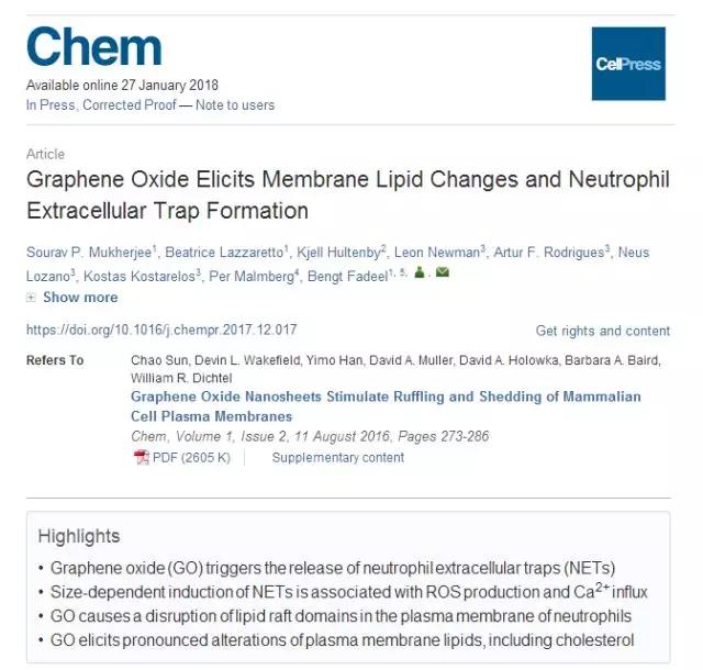 1月27日,《化學(xué)》(Chem)在線發(fā)表了曼徹斯特大學(xué)和Chalmers技術(shù)大學(xué)Karolinska研究所的研究人員,關(guān)于氧化石墨烯誘發(fā)膜脂變化和中性粒細(xì)胞胞外陷阱形成的最新研究成果。該論文題為“GrapheneOxideElicitsMembraneL...